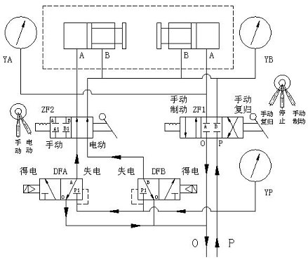 1、自動回路:將手動轉(zhuǎn)閥ZF1的手柄扳到停止位置,手動轉(zhuǎn)閥ZF2的手柄扳到電動位置,壓縮空氣進入電磁換向閥DFA、DFB的壓力腔(進氣腔),并密封在壓力腔內(nèi),左、右工作腔與排氣腔接通。