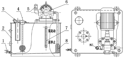 5、出油口 6、齒輪油泵 7、液位計(jì) 8、濾油器